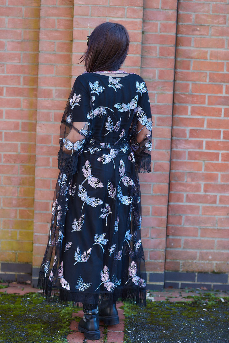 The Kimono Enchanted Wings is a true ode to nature and delicate elegance. Crafted from sheer, lightweight mesh, it is adorned with shimmering dragonfly appliqués—symbols of transformation, freedom, and harmony. Their delicate wings, embroidered with sparkling sequins, catch the light with every movement, adding an enchanting charm to any outfit.